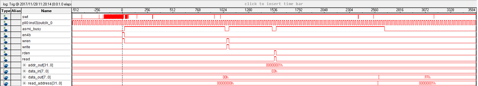 I first enable 4 byte addressing then write to the epcq then try to read from it. addr_out is the address I'm reading/writing to. data in is the random 8 bit number I'm writing to the epcq and data_out is where I am expecting to see the same number after I read; however, I only ever see FFh as an output on data_out instead of 03h as I would expect. I know that the read command hasn't finished in this screenshot but know that data_out does not change when the read command is done. (I was having a hard time fitting everything in the signal tap window.) the read_address shows the address that is being read from and this seems to be working fine.