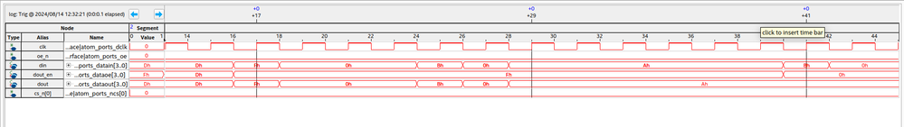 You can see this below which shows the reading of val3. The first mark shows the first address nibble (in dout). The second mark shows how 0xA is output in the first dummy cycle (i.e. mode) (in dout). The third mark is the data being returned (in din).