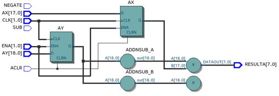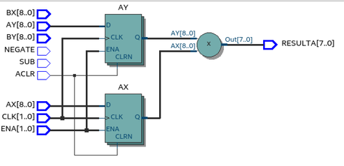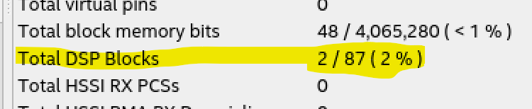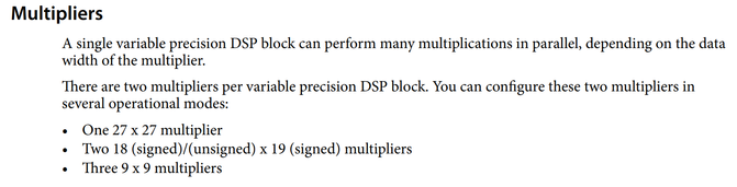 This block has two 8-bit multipliers and two 8-bit adders. As per the cyclone V device handbook, each variable precision DSP block can be configured as 3x 9x9 multipliers
