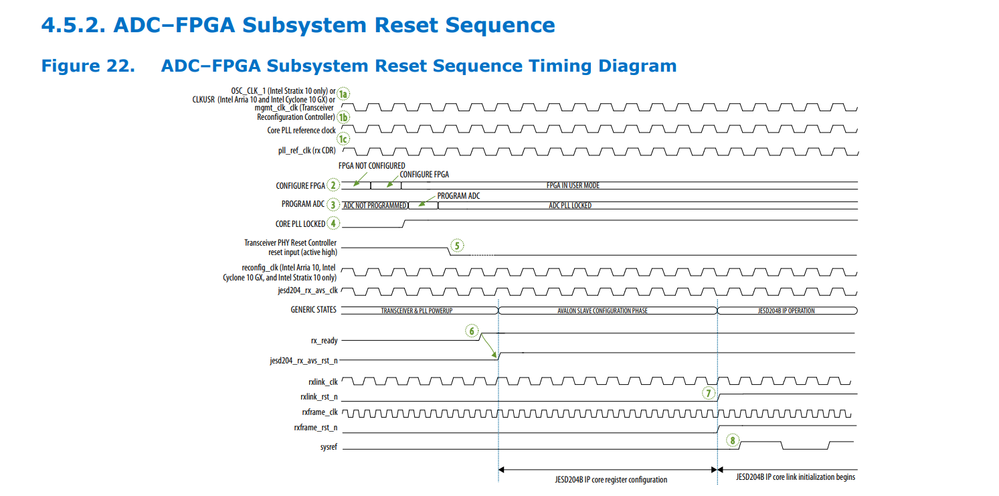 My device version is stratix10 1SX110HN2F43I2VG. I use FPGA to receive JESD204B data from ADC chip. When I power up the PCB, both the FPGA and ADC do not have device clock input, or the input is at a lower erroneous frequency.Then I configure the clock chip through SPI so that both the ADC and FPGA receive the correct device clock. However, the ADC still does not output JESD204B data. Then, I configure the ADC through SPI to output JESD204B data. I found that the rx_islockedtodata signal is 0. I tried disconnecting the xcvr_reset_control IP core, manually resetting rx_analogreset and rx_digitalreset, but still could not make rx_islockedtodata high. After reconnecting the xcvr_reset_control IP core and reloading the sof file, rx_islockedtodata successfully becomes 0xF. This means that even though the FPGA has received the 204B data rx_islockedtodata remains at 0. After reloading the sof file again, rx_islockedtodata becomes 0xF. How can I bring the rx_islockedtodata signal high without reloading the sof file? Or what variables during the process of reloading the sof file cause the rx_islockedtodata signal to go high? Does the FPGA only program sof file when ensuring JESD204B data input?