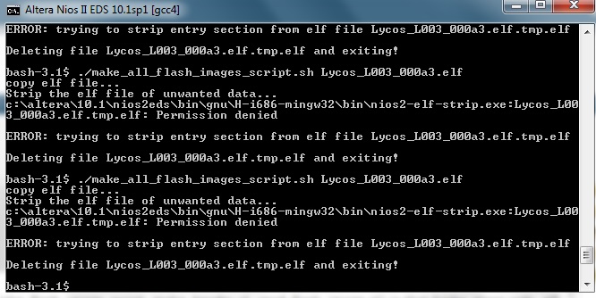 I recently upgraded to Windows 7 Professiona 64 bitl. I have a NIOS II project from a few years back that uses the Advanced Boot Copier, a custom boot loader provided by Altera (see http://www.altera.com/support/examples/nios2/exm-alt-boot-methods.html). The software includes a "make_flash_image_script.sh" that will package you .elf file into a boot record that is recognizable to the boot copier. All this works fine in WinXP. However, on Win7 I keep getting "Permission Denied" errors. Specifically, when script call the following utility: nios2-elf-strip --remove-section=.entry $tmp0_outfile_elf ; I get an error message: c:\altera\12.0\nios2eds\bin\gnu\H-i686-mingw32\bin\nios2-elf-strip.exe:PCI_Test.elf.tmp.elf: Permission denied I run the Nios II Command Shell in Administrative mode and I have set the permissions to Full Control in the properties for "make_flash_image_script.sh". Yet I continue to get the same error. I can take this same script and .elf file to my WinXP pc and it runs with no problems. I need this script to work on Win7. Does anyone have any idea how to resolve this? I would appreciate any help as I'm hitting my head against the wall at this point. Thanks, Kantoroi