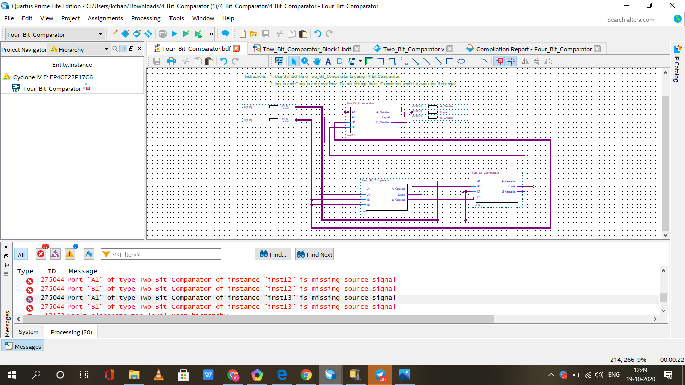 For the signal naming issues, for example, you have a 2 bit bus (B[1..0]) and then a single bit wire going into inst13. If only one bit of the B bus is to go into inst13, you need to add a signal label to that wire (named B[1]) for example. This type of fix is required in a number of locations.