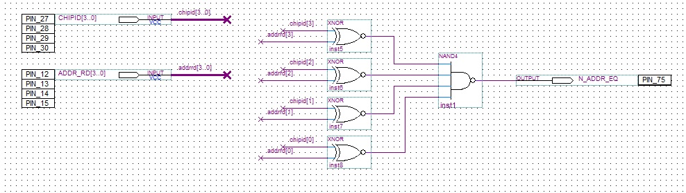 Setup: Quartus 9.0 (schematic entry) MAX-II EPM1270 I have been debugging my main schematic that seems to be working OK except for one little part... my Address_Match part. so I created and programmed "JUST" the Address_Match section (4 2-input XNOR gates that all tie to a 4-input NAND gate) so when ADDR = CHIP_ID the output goes LO. This SIMS fine and I get the results as expected.. but... when programmed into the PLD this simple circuit only produces a LO when all inputs are open (I do use weak-pullups). If I ground all the inputs, which would mean address 0000 and CHIP_ID = 0000 I still get a HI on the output. I get the same results on any address that matches CHIP_ID address. Anybody have any ideas? What do I have set up wrong? Keith (attached is my simple circuit)