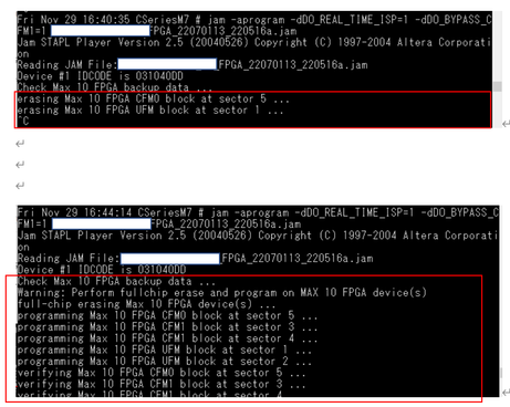 When CFM0 was corrupted and I tried to program CFM0 only by JAM Player, I got the message "Warning: Perform fullchip erase and program on MAX 10 FPGA device(s)" and erased full chip.