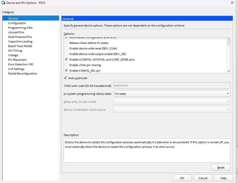 The settings for the generation of the .pof file and the .rpd files are shown below: