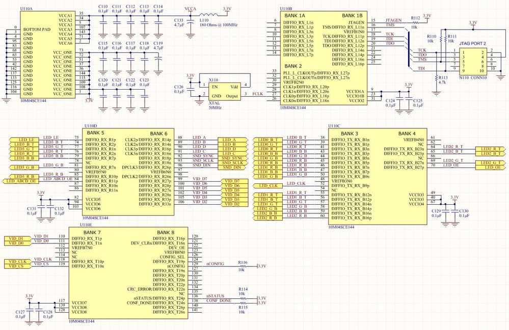 Attached is my FPGA design sheet. Disregarding the specific application, is there anything wrong with the FPGA connections? I did read on the Pin Connection Guidelines for the MAX10 family that unused CLK and PLL pins should be tied to VCCIO or GND. However, on my previous board, I left them open, and (maybe out of luck) everything worked fine.