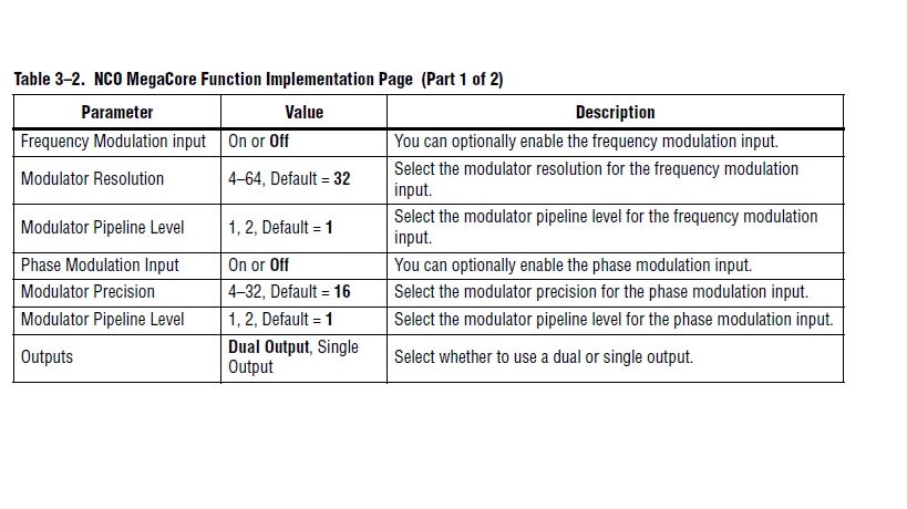 I am trying to generate sine output from NCO with in the range of 1Mhz to 21Mhz , Altera Megacore function NCO has an input called frequency modulation incremenet "freq_mod_i [F-1:0]" how does it work ? when i input a 16-bit word ( in my design) to freq_mod_i bus e.g 65535 , after a delay 65534 and then 65533 the output remained around 1.5Mhz . But when i input 4096 to this 16-bit bus i get 7.692Mhz How can i use NCO to increment frequency . Thanks