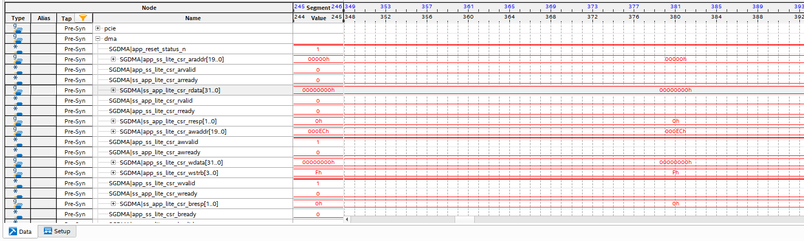 I also tried to use the SSGDMA IP together with the PCIe ip in my own design. when i set BAR0 to a 4KB prefetchable memory , i can write and read registers through the WinDriver , but i can't observe the axi st_rx_valid toggle high. The BAR0 memory is supposed to be in the SSGDMA and is read or written through axi-stream ports connected to the PCIe IP . What's more , i don't see the axi-lite awaddr_ready toggle high when SSGDMA try to write PCIe IP's csr registers .