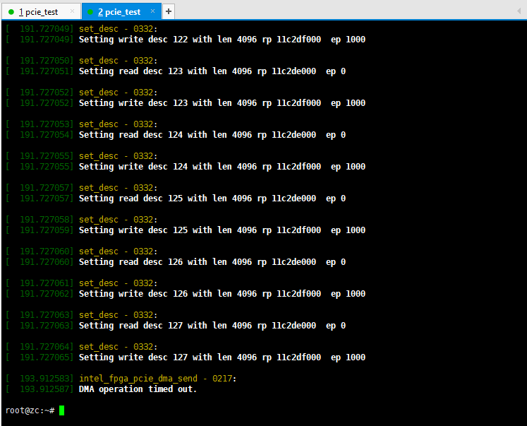 When I use the DMA IP core to transfer data to CPU, I always encounter DMA timeout issues, occurring every few seconds. The kernel prints “DMA operation timed out”.