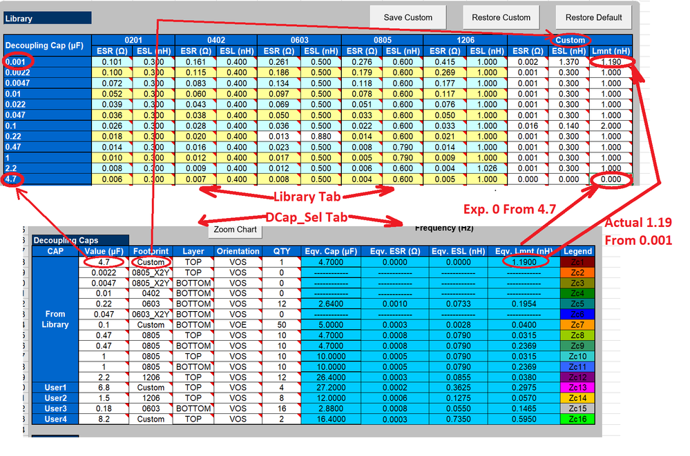 - The value of “Custom-Lmnt” in the Decap Selection Tab is not being set to the capacitors “Custom-Lmnt” from the Library Tab, instead it’s being set to the “Custom-Lmnt” of the capacitor value that’s in the same relative position in the Library Tab.