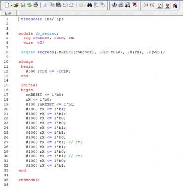 module tb_seqrec; reg rnRESET, rCLK, rX; wire wZ; seqrec seqrec0(.nRESET(rnRESET), .CLK(rCLK), .X(rX), .Z(wZ)); always begin # 500 rCLK <= ~rCLK; end initial begin rnRESET <= 1'b0; rX <= 1'b0; 19#100 rnRESET <= 1'bl; 20#1000 rX <= 1'bl; 21#1000 rX <= 1'bl; 22#1000 rX <= 1'b0; 23#1000 rX <= 1'b0; 24#1000 rX <= 1'bl; 25#1000 rX <= 1'bl; 26#1000 rX <= 1'b0; 27#1000 rX <= 1'bl; // Z=1 28#1000 rX <= 1'bl; 29#1000 rX <= 1'b0; 30#1000 rX <= 1'bl; // Z=1 31#1000 rX <= 1'b0; 32#1000 rX <= 1'bl; end endmodule I made it. l thought there is no error. but :/Test/seqrec2/tb_seqrec.v(19): Expecting numeric digits. ** Error: C:/Test/seqrec2/tb_seqrec.v(19): near "1": syntax error, unexpected "IDENTIFIER", expecting ';' ** Error: C:/Test/seqrec2/tb_seqrec.v(20): Expecting numeric digits. ** Error: C:/Test/seqrec2/tb_seqrec.v(20): near "1": syntax error, unexpected "IDENTIFIER", expecting ';' ** Error: C:/Test/seqrec2/tb_seqrec.v(21): Expecting numeric digits. ** Error: C:/Test/seqrec2/tb_seqrec.v(21): near "1": syntax error, unexpected "IDENTIFIER", expecting ';' ** Error: C:/Test/seqrec2/tb_seqrec.v(24): Expecting numeric digits. ** Error: C:/Test/seqrec2/tb_seqrec.v(24): near "1": syntax error, unexpected "IDENTIFIER", expecting ';' ** Error: C:/Test/seqrec2/tb_seqrec.v(25): Expecting numeric digits. ** Error: C:/Test/seqrec2/tb_seqrec.v(25): near "1": syntax error, unexpected "IDENTIFIER", expecting ';' ** Error: C:/Test/seqrec2/tb_seqrec.v(27): Expecting numeric digits. ** Error: C:/Test/seqrec2/tb_seqrec.v(27): near "1": syntax error, unexpected "IDENTIFIER", expecting ';' ** Error: C:/Test/seqrec2/tb_seqrec.v(28): Expecting numeric digits. ** Error: C:/Test/seqrec2/tb_seqrec.v(28): near "1": syntax error, unexpected "IDENTIFIER", expecting ';' ** Error: C:/Test/seqrec2/tb_seqrec.v(30): Expecting numeric digits. ** Error: C:/Test/seqrec2/tb_seqrec.v(30): near "1": syntax error, unexpected "IDENTIFIER", expecting ';' ** Error: C:/Test/seqrec2/tb_seqrec.v(32): Expecting numeric digits. ** Error: C:/Test/seqrec2/tb_seqrec.v(32): near "1": syntax error, unexpected "IDENTIFIER", expecting ';' what's wrong?