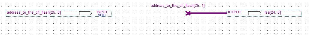 I found a problem when i try to connect the pin in .bdf file~ This is part of my verilog file output [24:0] fsa, wire [25:0] address_to_the_cfi_flash; assign fsa = address_to_the_cfi_flash[25:1]; My problem is that how can i connect the [25:1] to the pin with [24:0] in a bdf file ? Thanks! Jeorge