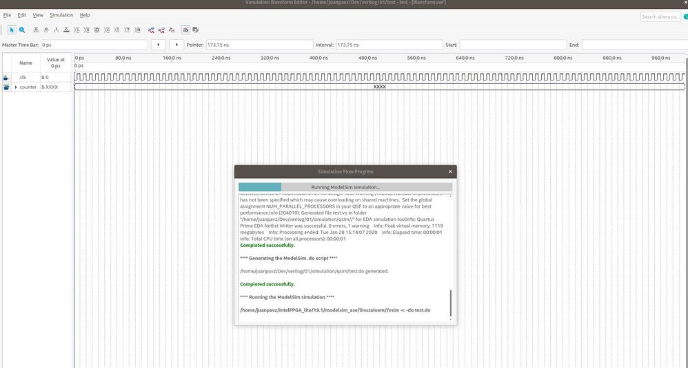 Simulation options in Functional Simulation Settings: quartus_eda --gen_testbench --tool=modelsim_oem --format=verilog --write_settings_files=off test -c test --vector_source="/home/juanpavz/Dev/verilog/01/Waveform.vwf" --testbench_file="/home/juanpavz/Dev/verilog/01/simulation/qsim/Waveform.vwf.vt"