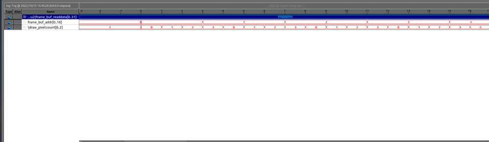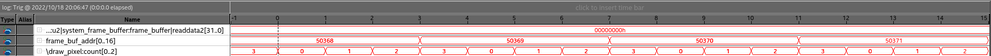 As is visible in the picture, the frame_buffer_readdata does not change its data to the corresponding frame_buf_addr. I have tried playing with the byteenable and chipselect signals but nothing seems to work getting the module to respond to the address change.