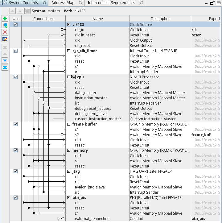 I now seek to access the memory set by the Nios II code in VHDL to retrieve the pixel data and pass them onto the VGA interface, this should be possible with the dual access memory module in QSYS.