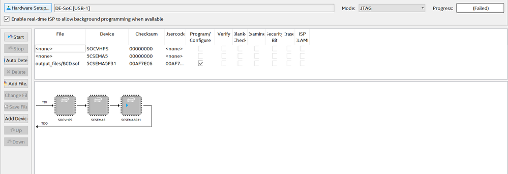 I have recently purchased the DE1-Soc board of Terasic. I have been using the Quartus design suite for quiet a while but only for simulation. I have went through the steps of designing a very basic program. Every time i try to program it it says failed straight away. I have done more research and it says i need an intel Soc Embedded design Suite. I am just wondering is that the issue? The device is 5CSEMA5F31C6. Any help would be great. i just want to start using the board for projects now.