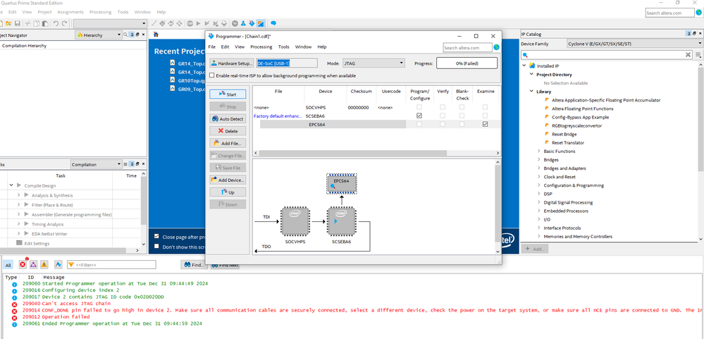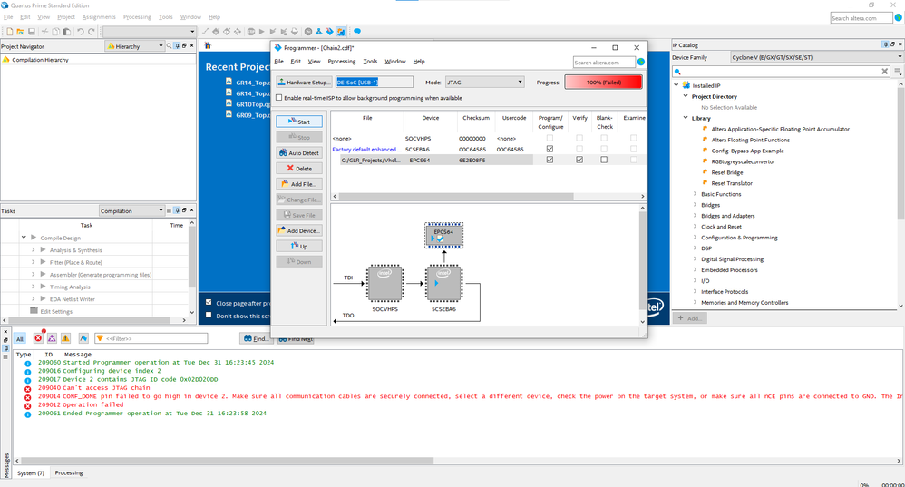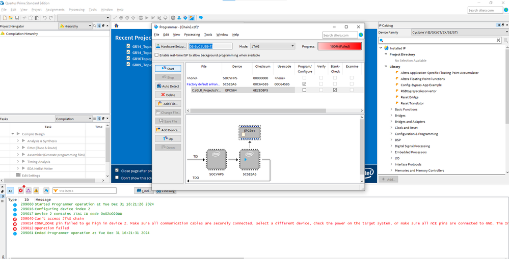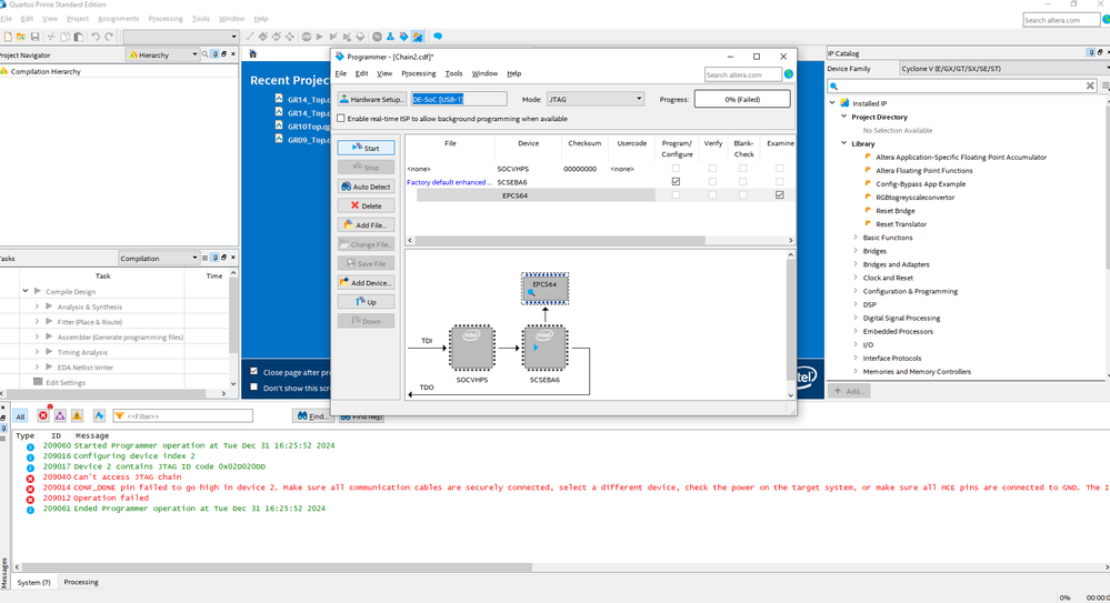 Error (209014): CONF_DONE pin failed to go high in device 2. Make sure all communication cables are securely connected, select a different device, check the power on the target system, or make sure all nCE pins are connected to GND. The Intel FPGA Knowledge Database contains many articles with specific details on how to resolve this error. Visit the Knowledge Database at https://www.altera.com/support/support-resources/knowledge-base/search.html and search for this specific error message number.