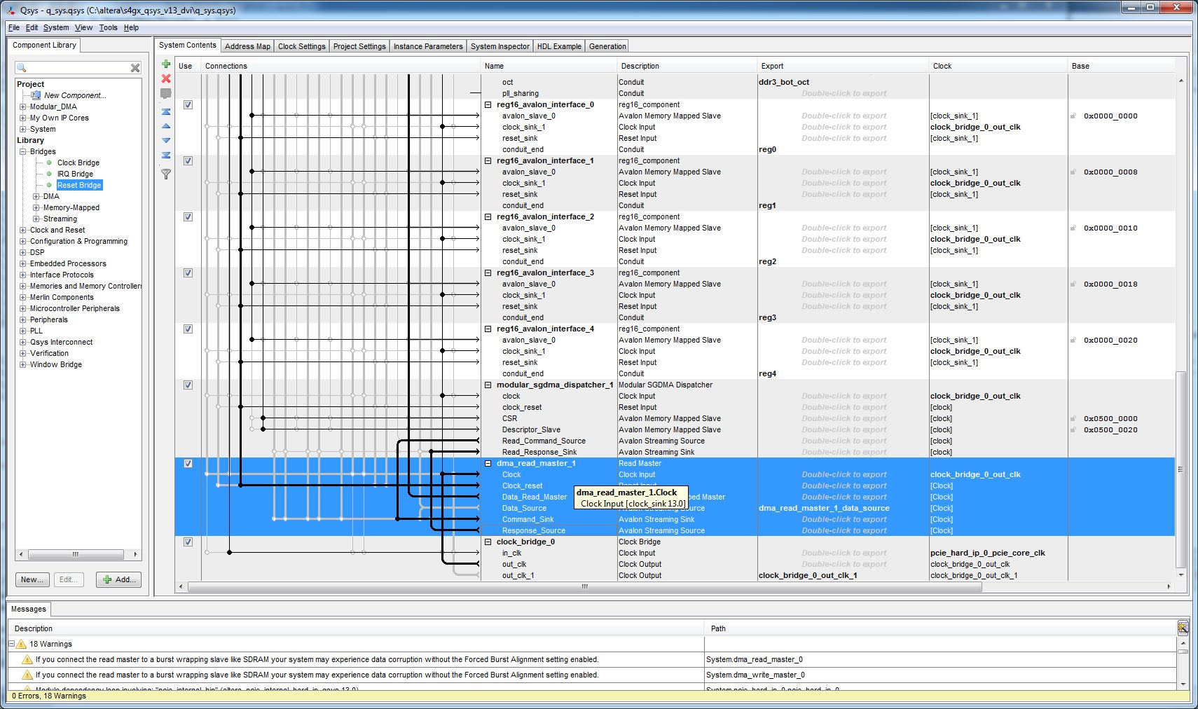 I have a PCIe / DMA QSYS project which uses the module SGDMA in MM to ST mode. I'm streaming to a FIFO. I had to export the data source port of the read master so I could tie it to my FIFO. I want the write side of the FIFO to run at the PCI core, 250MHz. In order to accomplish this I had to use a Clock Bridge with two outputs: one output feeds all of the other components in my QSYS design and the other one is exported so I can tie it the write clock of my FIFO. When generating my QSYS, I get the following error. Error: q_sys_tb.q_sys_inst: q_sys_inst.dma_read_master_1_data_source and q_sys_inst_dma_read_master_1_data_source_bfm.sink must be on the same clock domain, since they're connected. QSYS generates a BFM for this port which seems to be tied to this error. When I dig in the qsys.v file, I see this instantiation. It has the .clk port tied to the 50MHz clock which feeds the cal_blk_clk and reconfig_gxbclk of the PCIe IP. q_sys_inst_dma_read_master_1_data_source_bfm ( .clk (q_sys_inst_clkin_50_bfm_clk_clk), // clk.clk .reset (~q_sys_inst_clkin_50_clk_in_reset_bfm_reset_reset), // clk_reset.reset .sink_data (q_sys_inst_dma_read_master_1_data_source_data), // sink.data .sink_valid (q_sys_inst_dma_read_master_1_data_source_valid), // .valid .sink_ready (q_sys_inst_dma_read_master_1_data_source_ready), // .ready .sink_startofpacket (1'b0), // (terminated) .sink_endofpacket (1'b0), // (terminated) .sink_empty (3'b000), // (terminated) .sink_channel (1'b0), // (terminated) .sink_error (1'b0) What does this mean and how do I fix? https://www.alteraforum.com/forum/attachment.php?attachmentid=7733 Rob