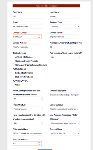 Hello Support   Q1: I am currently teaching Digital Logic Design 2 with Verilog and VHDL. I requested DE10-Lite donations from Intel. I believe the transition from Intel back to Altera FPGA may have...