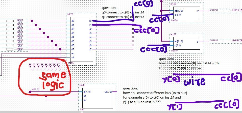 Hi, sorry for stupid question ๐ , newbie with bus, as you can see I have done 3 chips in vhdl, one without vector, that is simple but bad vhdl code (not optimal) the I have done the other 2 with vector question is how do connect a out bus to a different in port bus, and also the one I have reuse how do i connect different signal to same but different bus ???