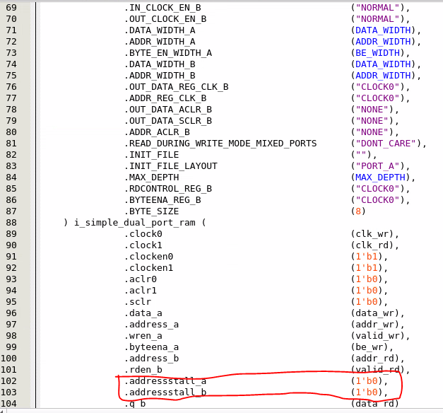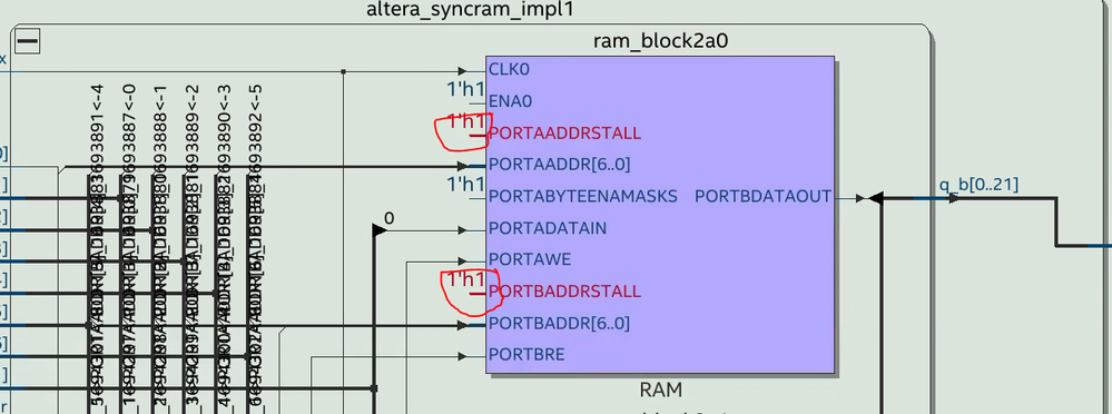 I am using "simple_dual_port_ram" primitive in my design having for agilex 7i (part#AGIB027R29A1E2VR3), I am forcing the addressstall_a/b signals to zero in the instance, the design is being compiled using quartus prime pro 24.1. I see these pins in the netlist are being tied to 1. Can you help me why this is happening?