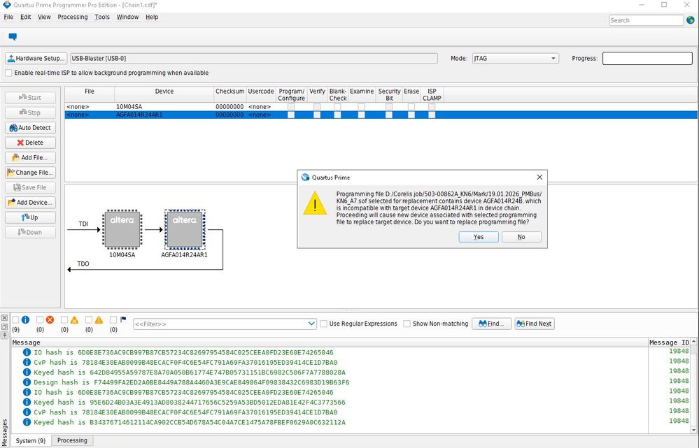 Warning message "Programming file selected contains device AGFA014R24B which is incompatible with target device AGFA014R24A in device chain" appears when programming sof file is applied.