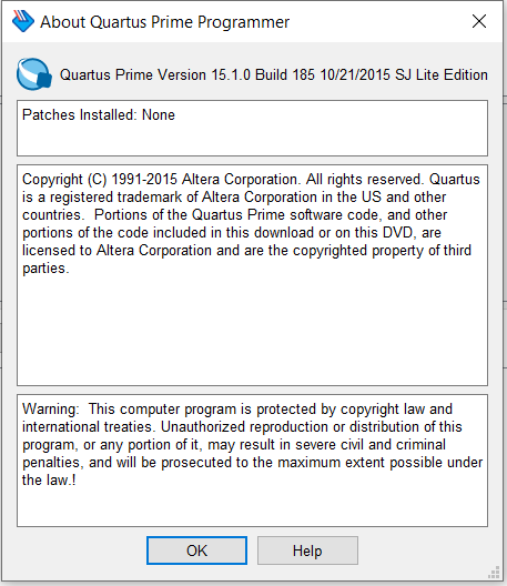 I am using Quartus Prime 2 15.1.0 Build 185 10/21/2012 SJ Lite Edition (No Patches Installed)