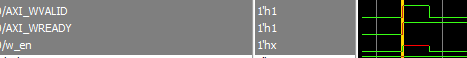 I am simulating a Platform Designer Cyclone 10 LP NIOS V system in Questa Starter Edition. After generating and modifying the testbench, I run the simulation in Questa. The simulation runs smoothly until a write to my Hyberbus controller IP. My Hyperbus controller IP has an AXI4 interface. During AXI write, a w_en signal goes high when the AXI_WVALID and AXI_WREADY signals are high. However, when this occurs, the w_en signal goes red in Questa and I am not sure why. Neither input is red and I'm not sure what else could make it go red. The waveforms and associated verilog code is attached. Can anyone share a possible reason for why the w_en signal goes red and what I can do about it?