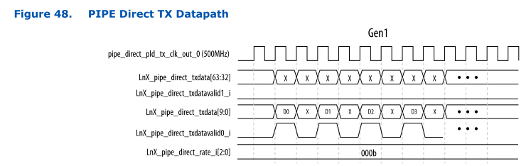 However, in Figure 48, the PIPE Direct TX Data Path for Gen1 seems to show a format where only txdatavalid0 toggles.