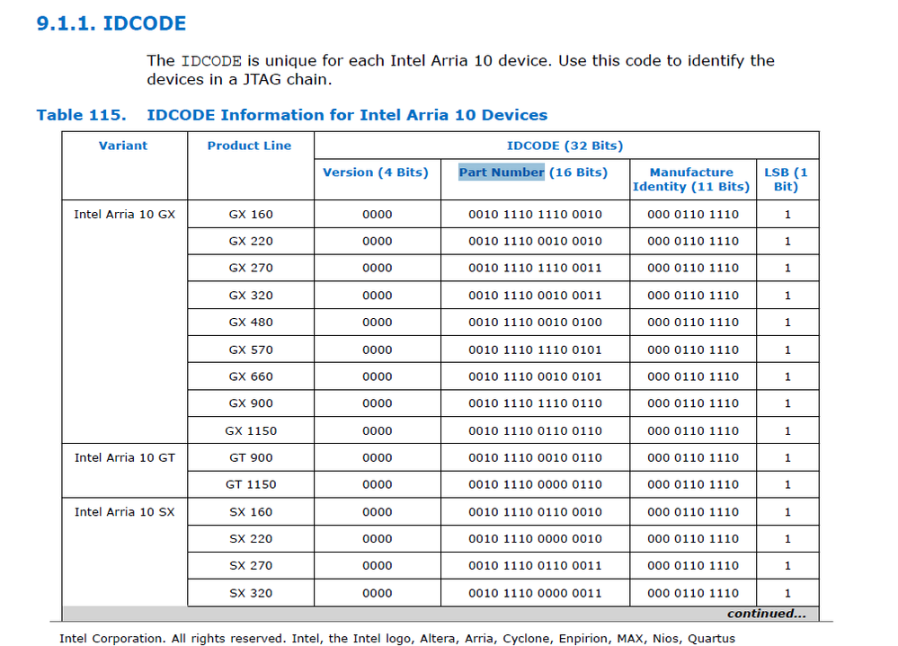 Do you know a way of retrieving the complete device/model number (sth. like 10AS016E4F29E3SG) of an Arria10 at runtime? Maybe through some register/IP core? The ChipID IP core only provides a unique ID, i.e. serial number, as far as I can tell.