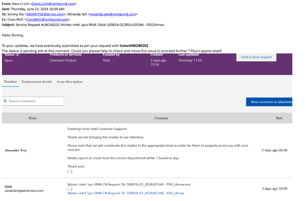 Thanks for asking. Regret to inform you that I have failed to submit any RMA till to-date. I was direct to fill an ESR form and Global RMA form but was still pending at the moment. For Intel RMA, do you have any SOP or User Manual/ Guideline that can be provided so that we know exactly how the correct application flows are and what information/details are needed for the submission. This is so unprofessional and not effective. It's has been a month and now CM is urging for a firm revert while Intel team is unable to resolve any RMA proceeding. Please understand and would be appreciate if you could help to make this to move. Thank you so much!