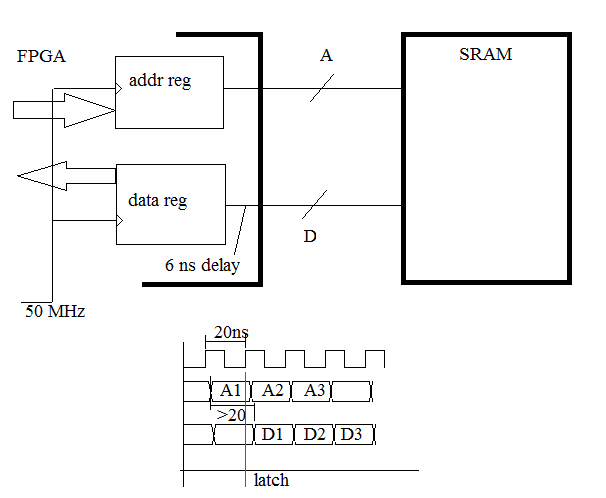 Here is my setup on a Terasic DE1 board, which uses a CycloneII FPGA and an attached 10ns async SRAM device.