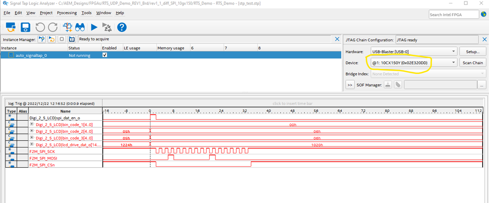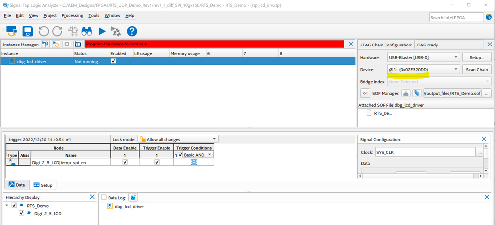 Using SFL to program the device is successful over the JTAG (See attached SFL.png). But, when opening the Signal Tap, it keeps saying, "Program the device to continue" (See attached Signal_tap.png). I have checked all parts related to JTAG and they are all correctly installed, consistent with the schematic attached.