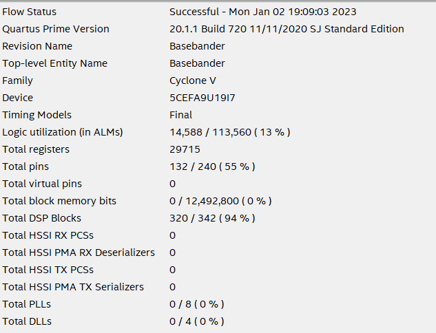 I'm developing for a Cyclone V (5CEFA9U19I7) and I'm booting from a EPCQ32A. The program doesn't come close to using all of the resources on the Cyclone V (with the exception of the DSP blocks).