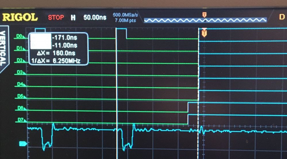When I make changes to code, sometimes it works and sometimes it doesn't. It feels like the hardware equivalent of a wayward software pointer stomping over memory 😐 . I have had this problem for months since I first wrote the code. It happens on my mk1 144 QFP pin CycloneII homebrew board, and not it happens on my mk2 208 pin CycloneII board. I now have enough pins for 8 diagnosttics LEDs which helped confirm the suspicion (I bring out the state variable to the 8 LEDs). I have also now captured the event on my scope.