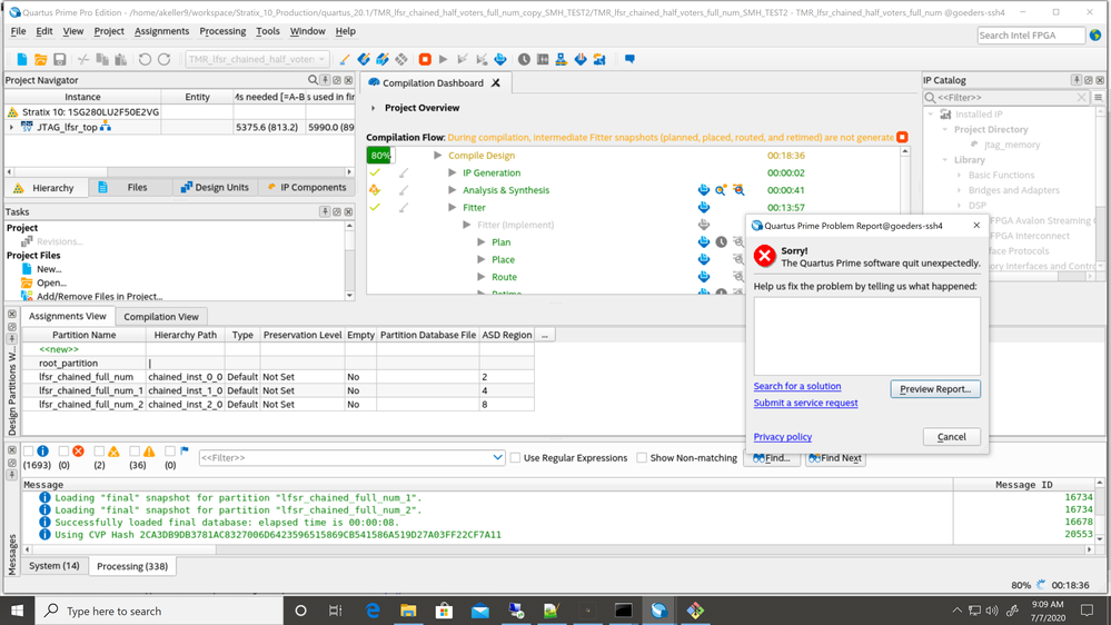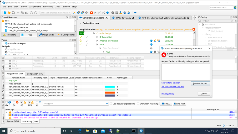 I am making several designs on the stratix 10 (1sg280LU2F50E2vg). I have found that if I declare more than 4 partitions as ASD regions than it will crash with an unexpected error during the assembler. As long as I have declared 4 or less regions it generates fine. I have tried this on several different designs and they all behave the same. 4 regions is below documentation specs in the SEU mitigation guide am I somehow messing up the declarations or missing a setting somewhere?