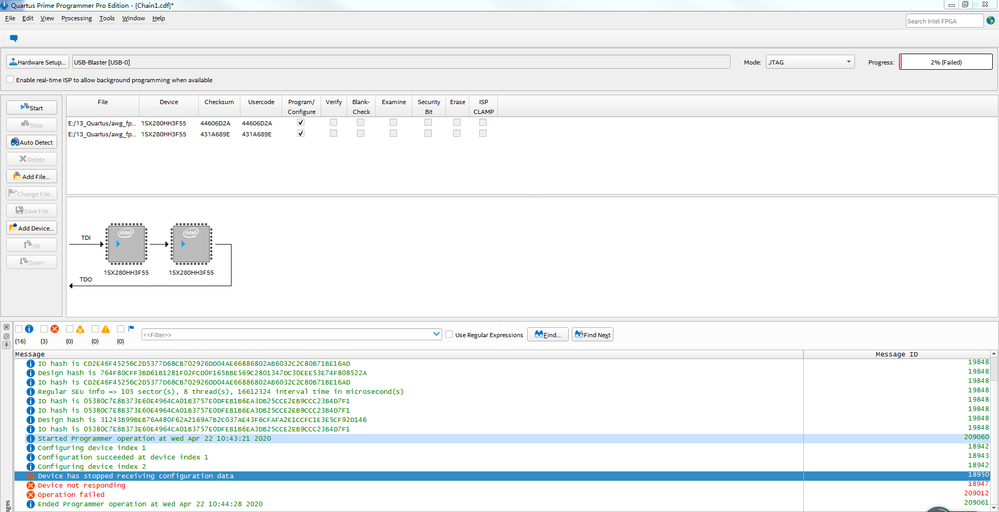Can identify the JTAG chain, where FPGA0 can download the sof file normally, FPGA1 fails to download the sof file, stuck at 2%