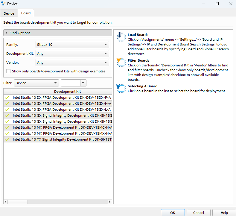 In the Quartus Prime Version 24.2.0 SC Pro Edition, why under the device/board list it doesn't show Stratix 10 SX SoC Development Kit.