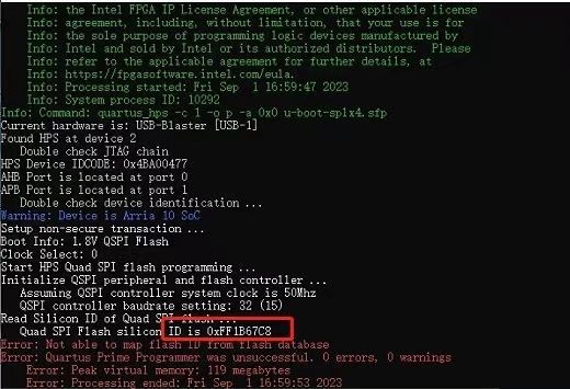 Question: GigaDevice NorFlash, model GD55LB01GEFIRY, cannot be burned through Quartus command line or graphical interface tool. In the following figure, the red box indicates an error when writing on the command line. The ID cannot be identified.