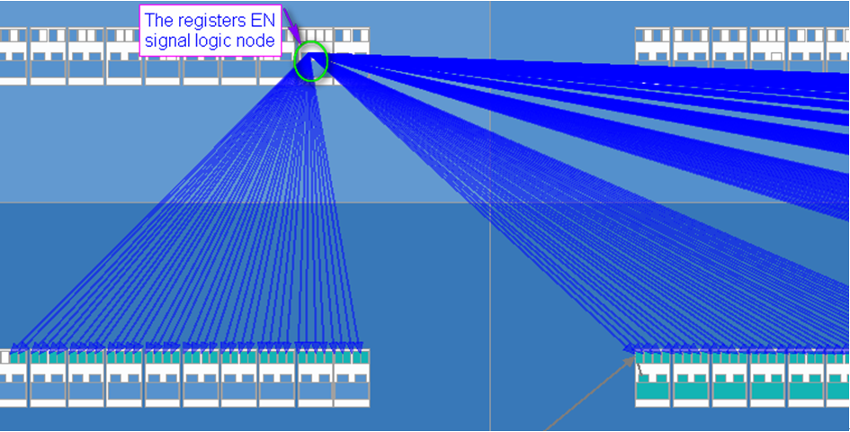The FF primitive is called to implement above circuit, and the FF's enable port is uesed. The "enable" node is used to enable all resgisers. So this "enable" logic node is high fan-out node, as following image.