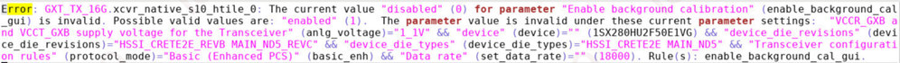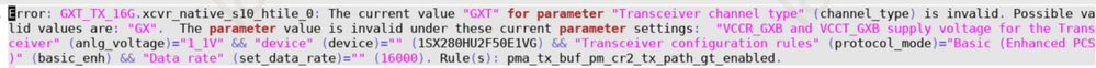 In the L-Tile/H-Tile Transcever Native PHY Intel Stratix 10FPGA IP , set the VCCR_GXB and VCCT_GXB supply voltage for the transceiver to 1_1V, select GXT for transceiver channel type ,select Basic(Enhanced PCS) for Transceiver configuration rules, and set Data rate to 16000M. Use the default parameters for the rest of the settings. There will be an error as shown in the figure below: