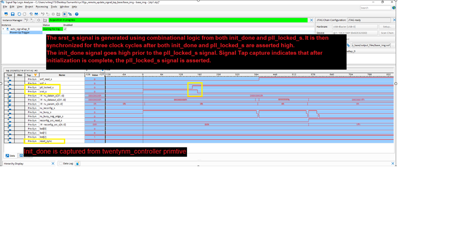 Signal Tap data was captured during power-up by setting the trigger to the reset signal. From the capture, it is clear that init_done goes high prior to the pll_lock signal. This confirms that the logic is not attempting to read the remote update register during initialization.