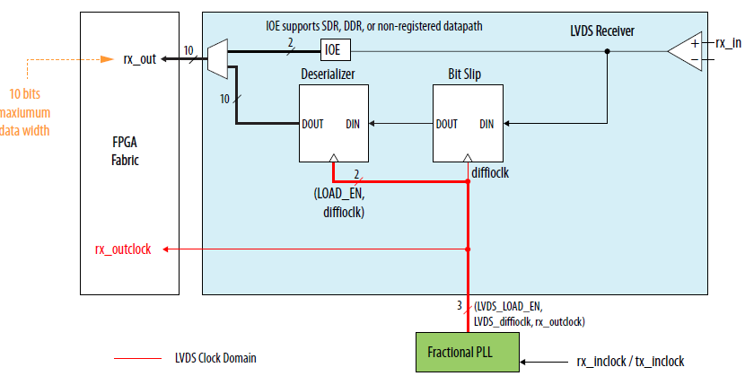 In a recent project I would like to use a camera with a clock of 290 MHz when using Double Data Rate. The throughput rate is therefore 580 Mbps per channel for a total of 10 channels. Now it would be helpful if I could use the transceivers in the Cyclone V for deserialization.