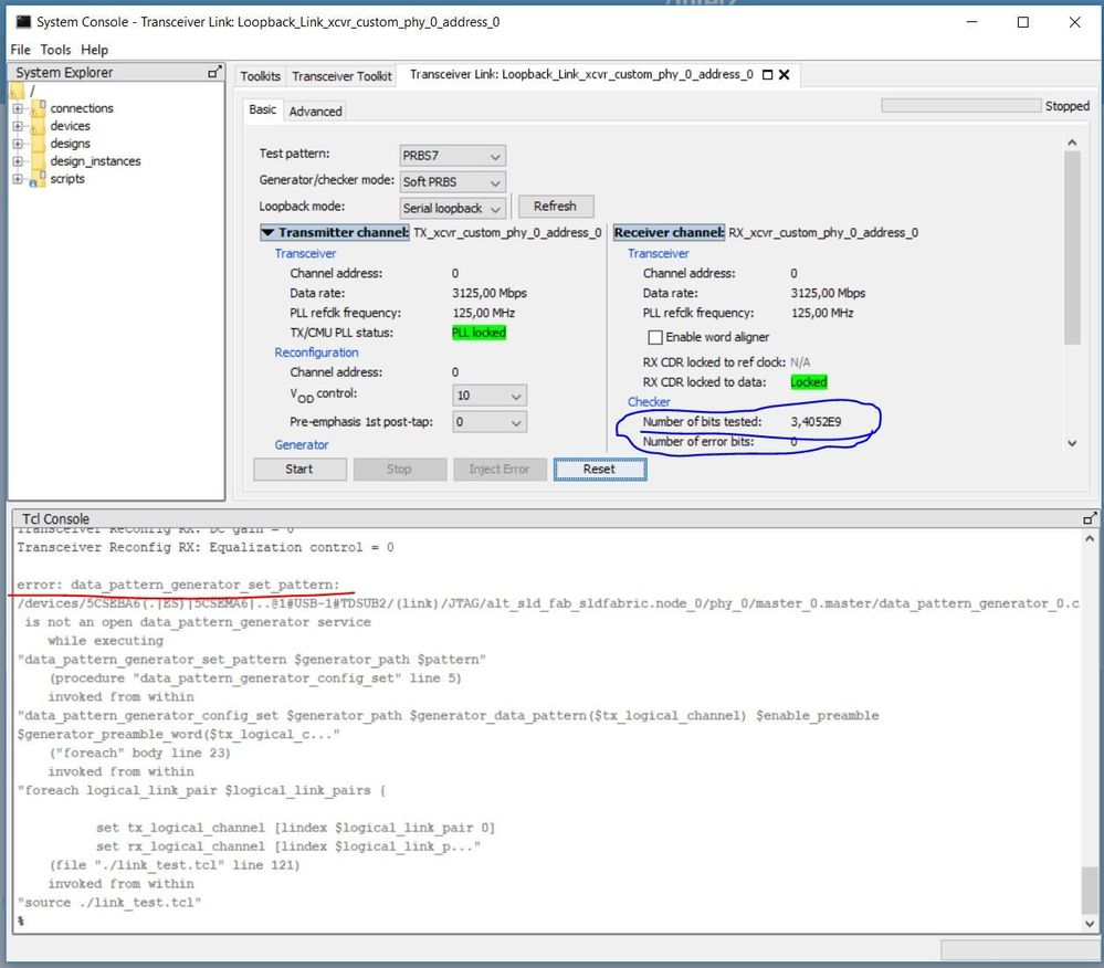 An example contains also a TCL-script (link_test.tcl) for the scripting API based testing. But this script fails to open the data_pattern_generator service (see red market error message). The open_service doesn't report any errors but any access to the settings of the data_pattern_generator FAILS.