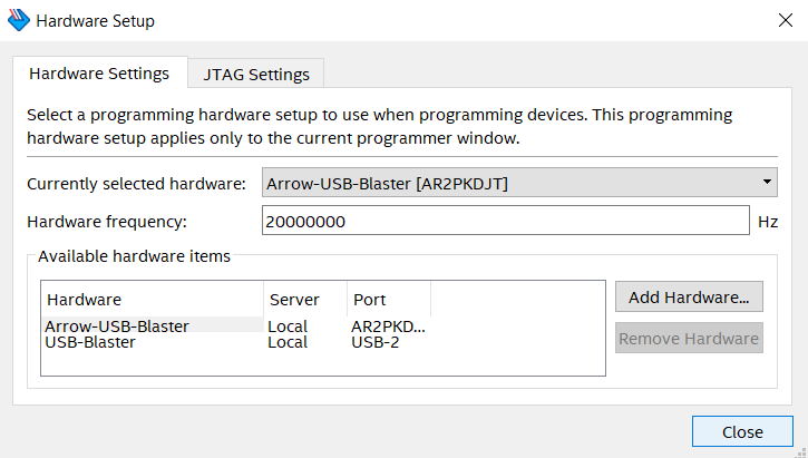 I need to debug two FPGA systems simultaneously. One is the Trenz Cyclone 10 board which includes an Arrow-USB JTAG interface and a second board with a Cyclone IV GX and a Terasic Blaster debug pod. There seems to be no way to persuade the two instances of Quartus (20.1 Lite) to select one device each. Everything works separately.