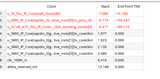 So I connect tx_bonding_clocks_ch0 of ATX PLL to tx_bonding_clocks_ch0~3 of RapidIO IP core, then I got timing analysis errors.