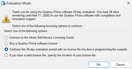 Hello, I am using Quartus Prime Standard Edition v15.1.0.185 in 30‑day evaluation mode. My goal is to compile a design and generate a .sof file during the evaluation period, but I am unable to prod...