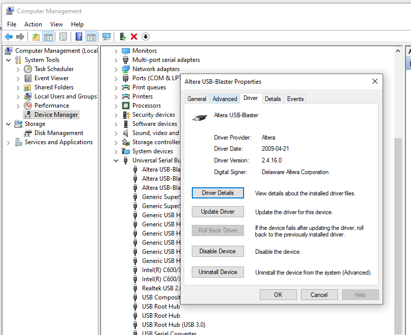 6 - When the PC restarts, use Device manager to update the drivers, point to the "drivers" folder in your quartus install directory