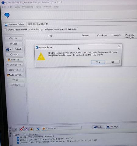 Hi I'm trying to program a "10M04DCU324I7G" device and I have 2 USB blaster Rev. C programmers. I'm using quartos programmer standard edition 25.1std.0 Build 1129 10/21/2025. Driver is 2.12.28.0 d...