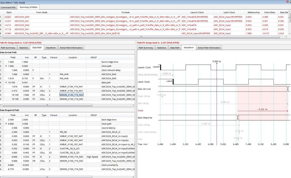 set_false_path -hold -fall_from {ADC_VirtualClk} -fall_to {ADC_DCLK_Input}The input delay value is based on ADC3224’s Tsu and Th, and I’m trying to use same-edge capture (virtual clock à ADC_DCLK) instead of opposite-edge.